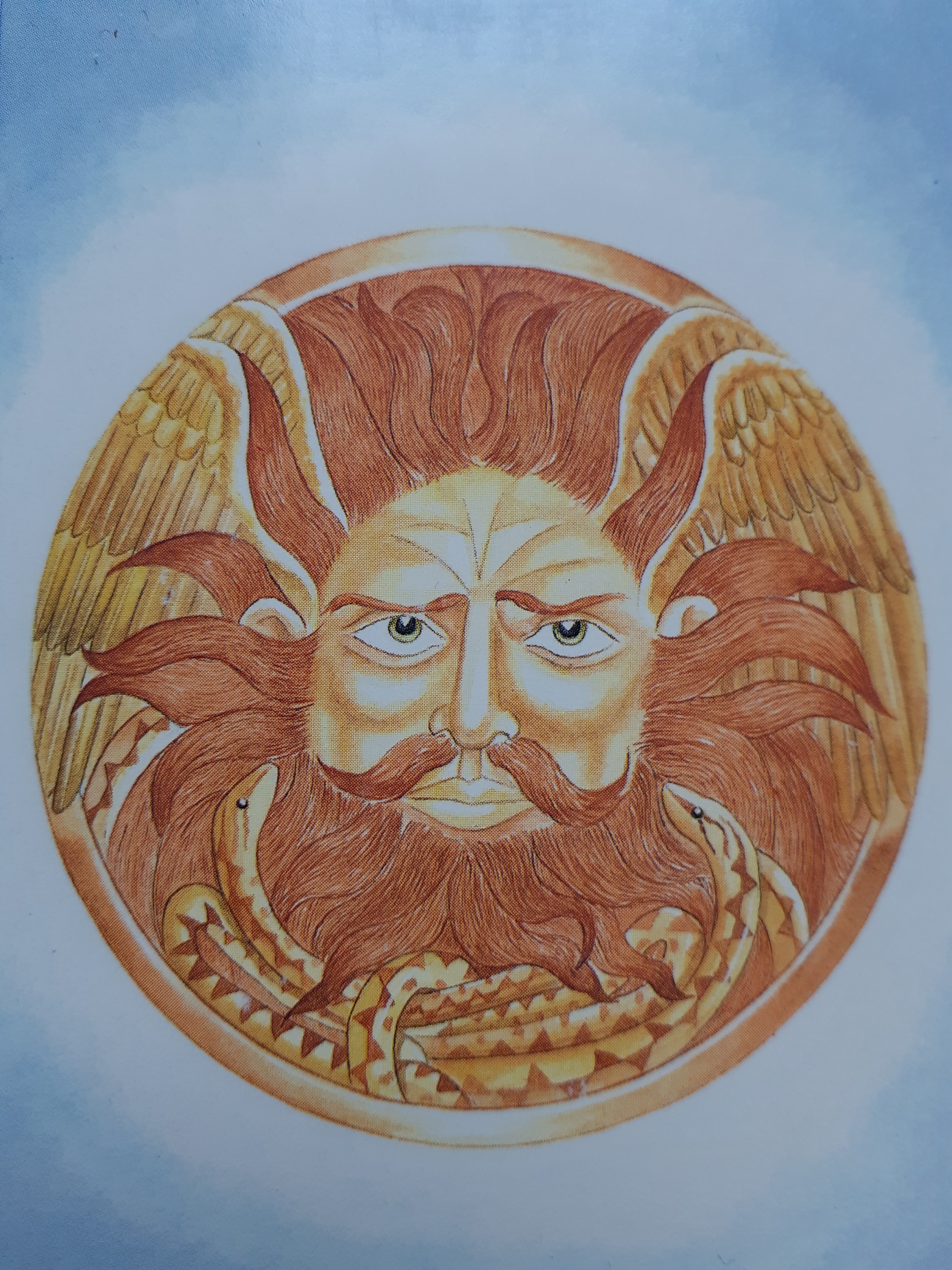 On show in the museum at Bath is a superb Celtic solar head (often inaccurately called a Gorgon’s head). The carving is a circular relief of an imposing male face with wild hair, long moustaches and staring eyes. He has wings on either side of his head and is surrounded by flames. Beneath his chin are two serpents, linked in the manner of a torque, the Celtic symbol of royalty. This solar deity is probably the being called Bladud in the legendary histories, connected to magic, flight and a fall from the heights to the depths. He has upon his brow the mark of the three rays, which are very often described as the primal three powers of universal creation.