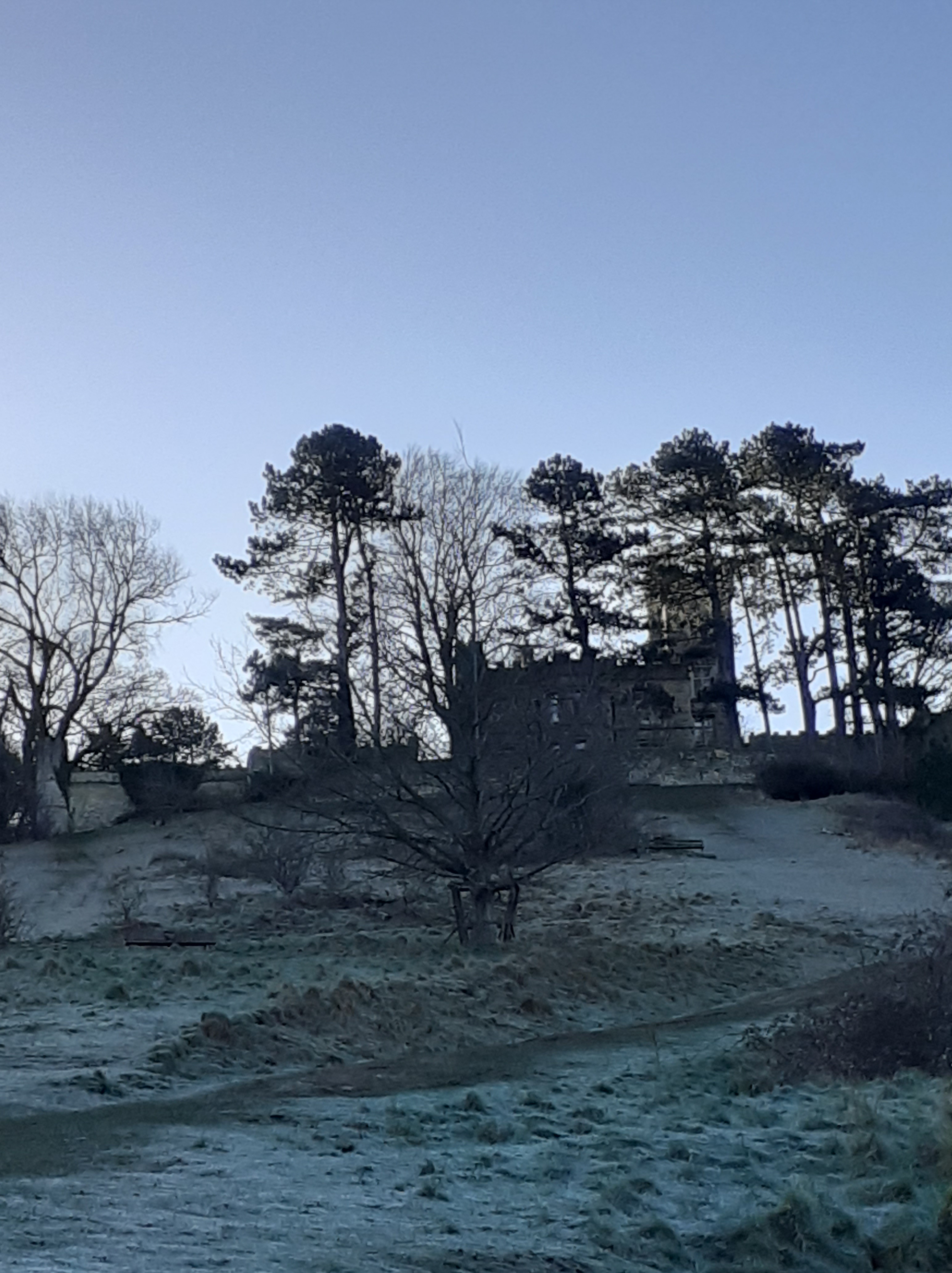 Looking out at the world, I see great variety. In one picture, above, I see a continuing wintry austerity. It is 26 February, somewhat before 9 am. I look up a hill on which the frost has yet to melt. It is daylight, with clear blue sky, but no direct sign of the sun. Light, indeed, but of a chilly kind. The trees have a stern look, reinforced by the battlements behind them – decorative though they might be on this nineteenth century folly of a fort.