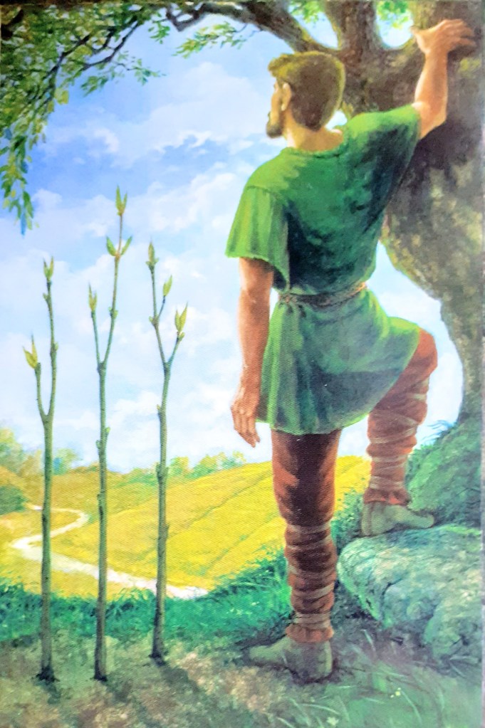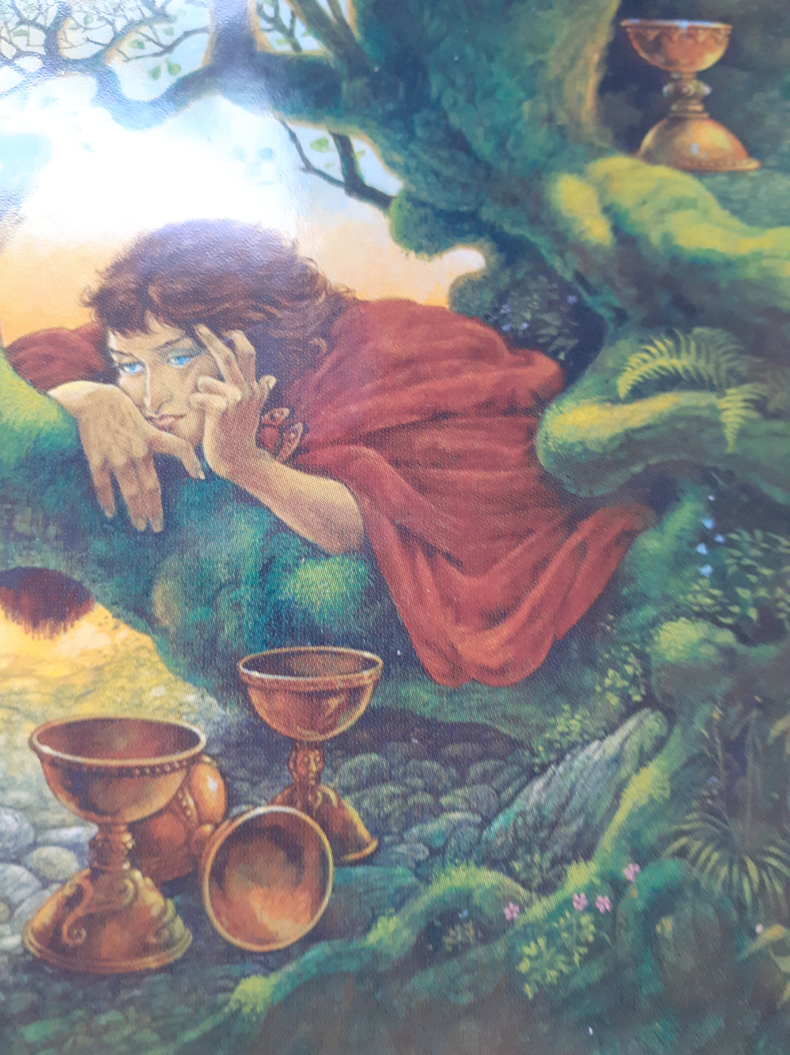 This image, the 3 of Wands from The Druidcraft Tarot (1), is one of purposeful effort beginning to be rewarded. The process is gradual but the promise is there. A young man looks with confidence at the world in front of his eyes. He seems at ease with himself, a young man resting in peace.