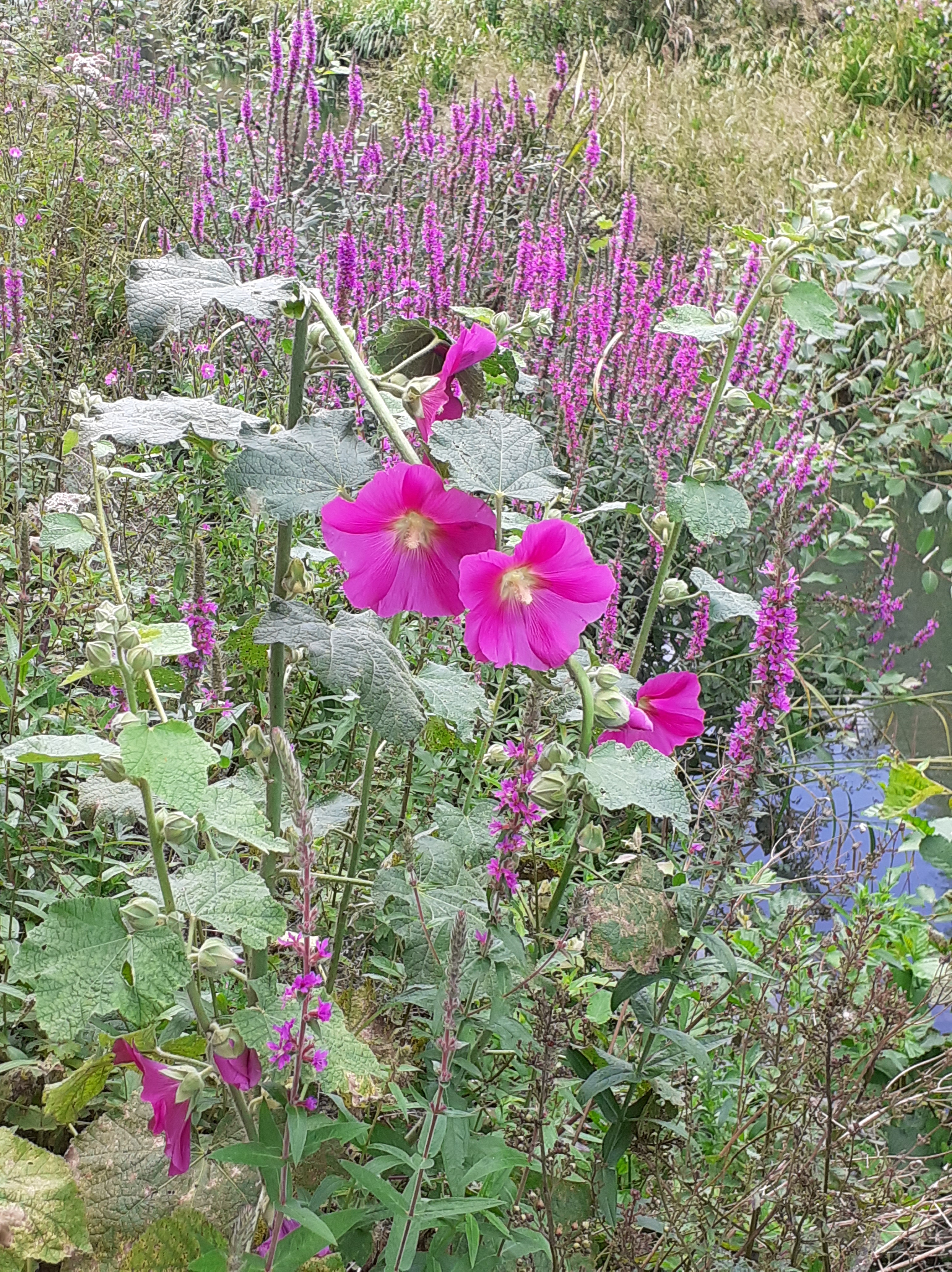 When I walk by this small stretch of land and water, I am astonished by a burst of colour and fecundity, an extraordinary profusion of life. It has the visual effect of a firework display, though silent and not perceptibly in motion to the human eye. The declining year technically makes this a decadent time, now giving the place itself an almost decadent feel. For me, the combination of mallow and purple loosestrife below illustrates this quality. I get a brief image of Morgause’s kitchen garden, seen through the eyes of a hostile Arthurian narrator, where the very lushness has a toxic and scary edge. Then the image disperses, and I am present, and myself, on the canal path once more.