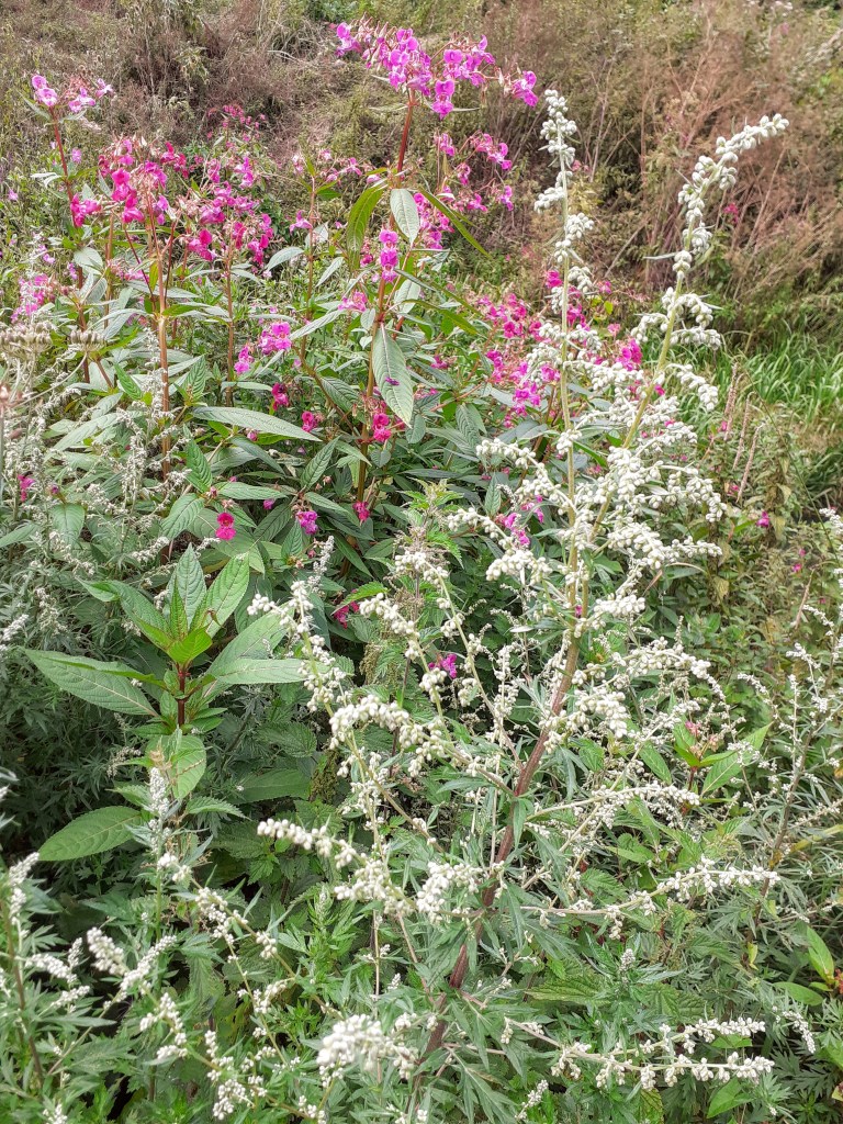 It is late summer now, where I live. I am conscious of earlier sunsets and darker evenings. I also notice the canal bank in floral abundance as the year begins to decline. This set of pictures was taken in a small area close to my home. The predominant colours are mauve/purple, white, and pink – all set within a rough carpet where green still predominates.