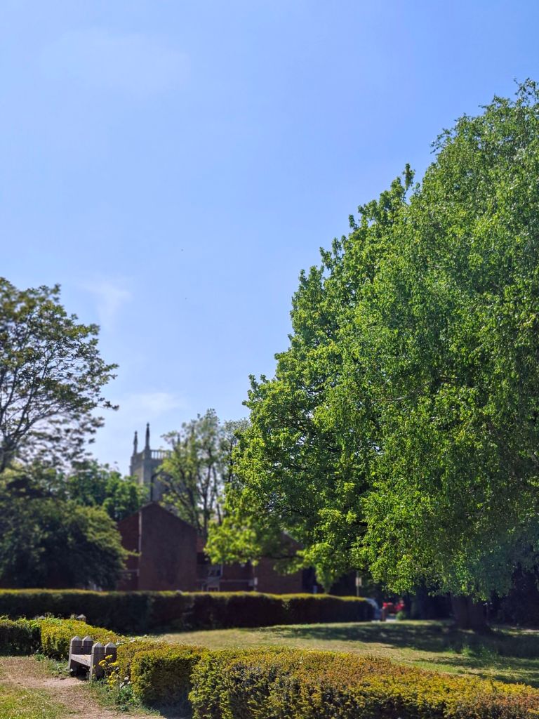 The church of St Mary de Lode, Gloucester, seems to sit among trees. The building salutes the sky without arrogantly trying to reach it. There is a bench towards the foreground of my picture. I am standing in a friendly urban space, a green space. It is one of many made possible by the Churches and Priories of the old city. This space is open to all.