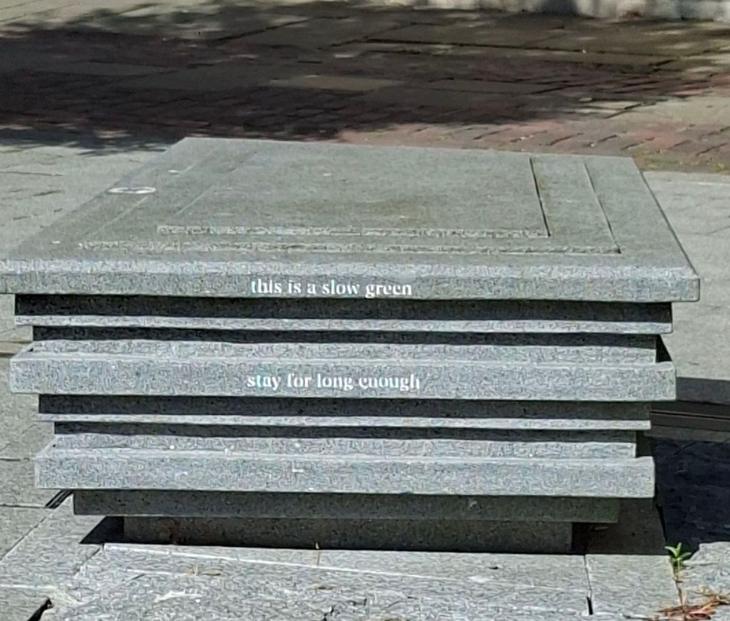 In another such space, on a granite seat close to my home, I recently noticed the words “this is a slow green, stay for long enough”. I have been savouring these words ever since.
