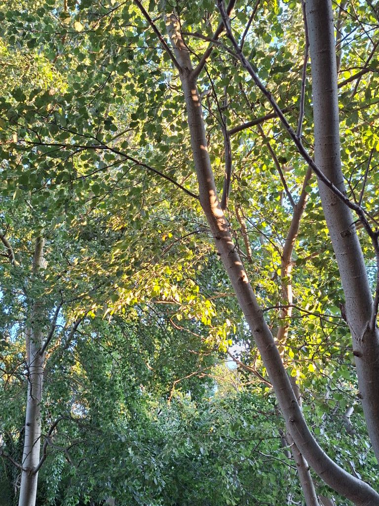 I am also aware of wanting to savour the sense of a change without wanting to hurry it on. Above, an image of trees, houses, hills and sky anchors me into a specific place and time. It’s a ‘now’ experience rather than an anticipation. Below, an image of birch leaves back-lit by electric light holds me in an appreciation of the pattern they make. I am held by the power of a simple pleasure.