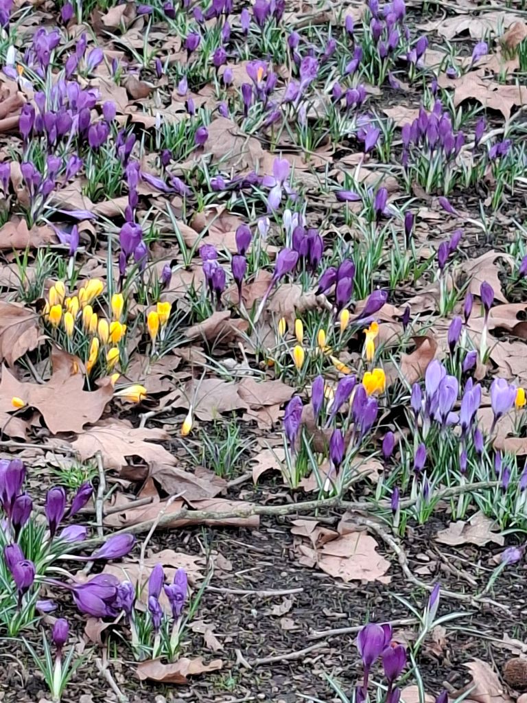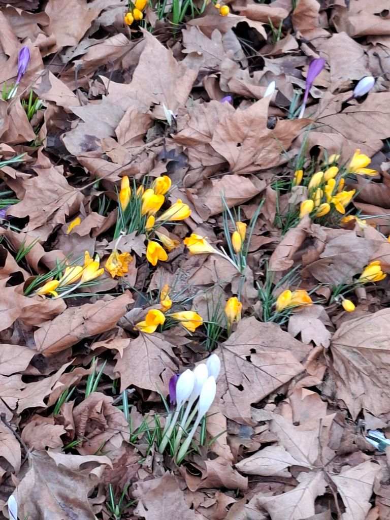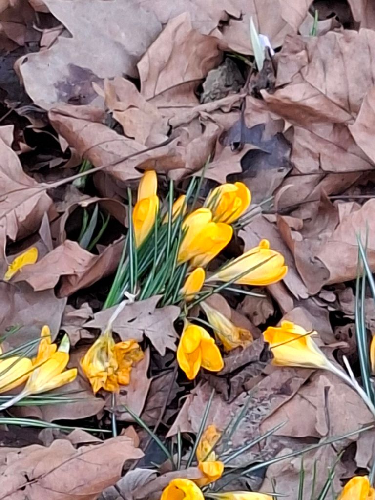 4pm, 9 February, Gloucester Park. I notice the ground in front of my feet. New life is emerging, pushing through last year’s fallen leaves. Crocuses – yellow, white, mauve – are making themselves known. Recent rain gives the blades of new green grass a fresh vitality. Feeling curious and energised, I enjoy an extended moment of contemplation on this small patch of land.