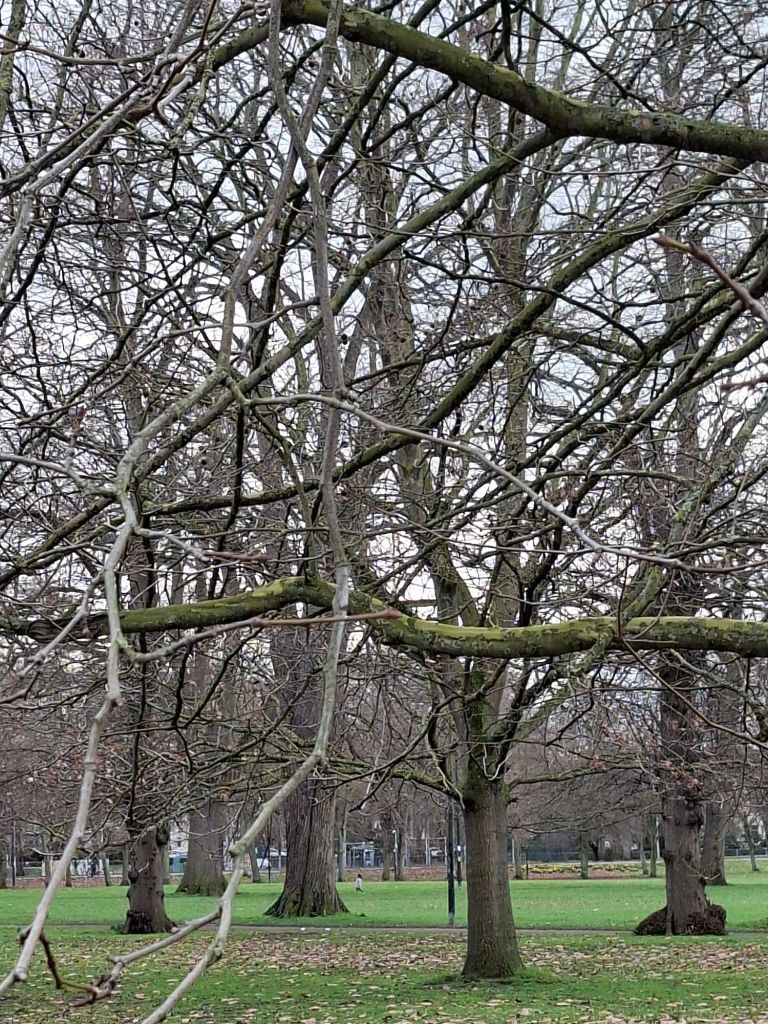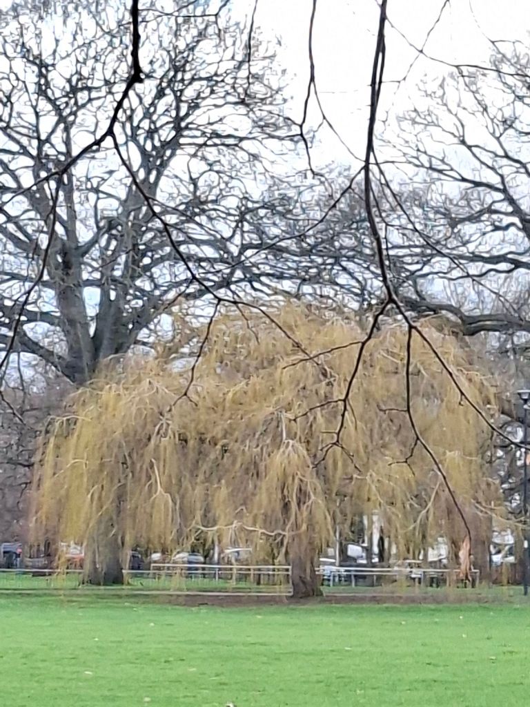 Then, looking around me, I find a contrast between the ground – active, emergent blooming – and the trees, with their still, skeletal branches and latent potential. The exceptions are the willows, already moving towards spring.