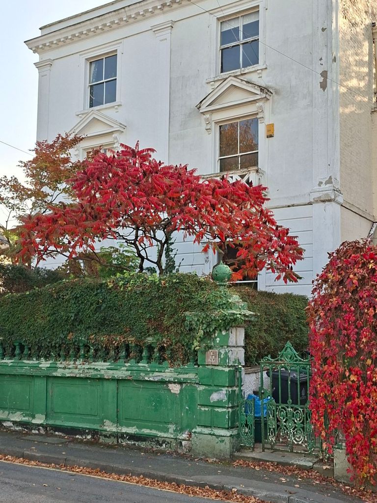 The road we took to and from the park offered leaves of autumnal red. I believe that the tree in the front garden is a stagshorn sumac. When I walk past the tree I get a little distracted by the property’s obvious need for a little tlc. Elaine however celebrates the opportunity taken by the Virginia creeper, as seen particularly in the second of the pictures below. It is great to see such abundance in this unpromising space.
