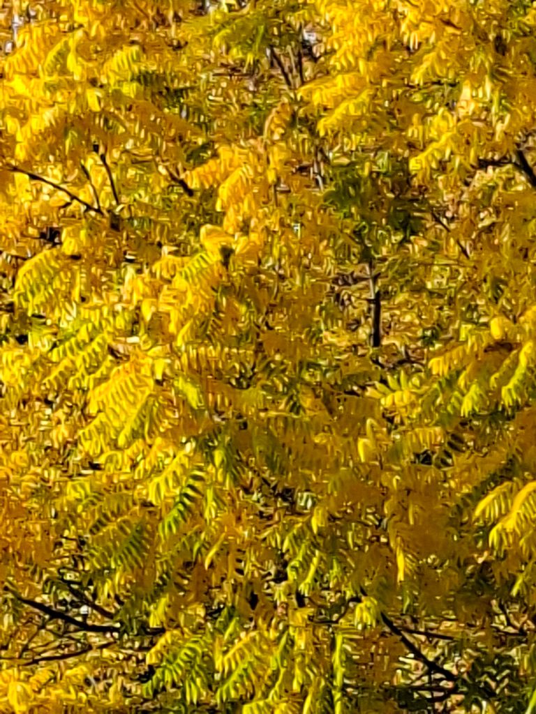 Below, the distinctive yellow of the tree of heaven, and its fern-like leaves, provide a powerful contrast that adds to our enjoyment.