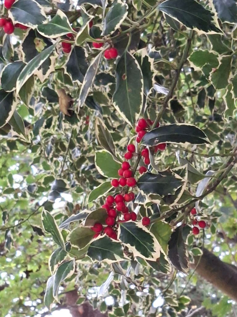 In the same space, I find both holly and ivy, with berries on the holly tree. I immediately thought of the Christmas carol The Holly and the Ivy. It is an ancient folk carol, which interweaves Christian themes and others that belong with the land. The version which is now popular was collected by Cecil Sharp in 1909 in Gloucestershire from Mary Clayton.