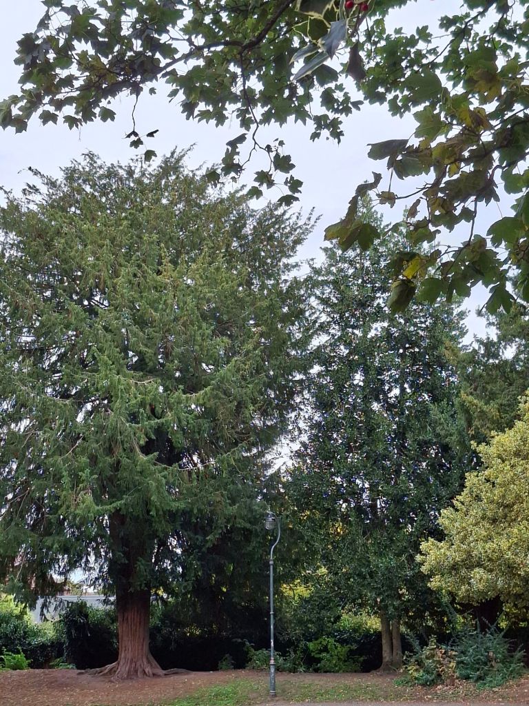 A Scots pine in Hillfield Gardens (1), 28 November, 10.32 am. It stands out both as a tall tree and an evergreen. It asks me to look up and pay attention to it, and beyond it, almost losing sight of its deciduous neighbour. For me, this representative of the ‘eternal green’ has a commanding presence.