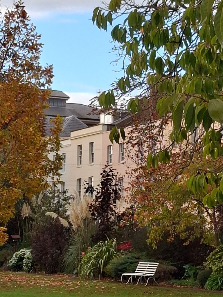 Below, I have stepped back further from the trees. My picture is of a clump of trees in the park. They are largish trees. The person walking past them is dwarfed. But I’m still enjoying leaves. I like the reddish brown emerging from residual green. I see Nature at work in a way that is both understated and beautiful. I know also that it can be a sheltering space within a generally flat and open park.