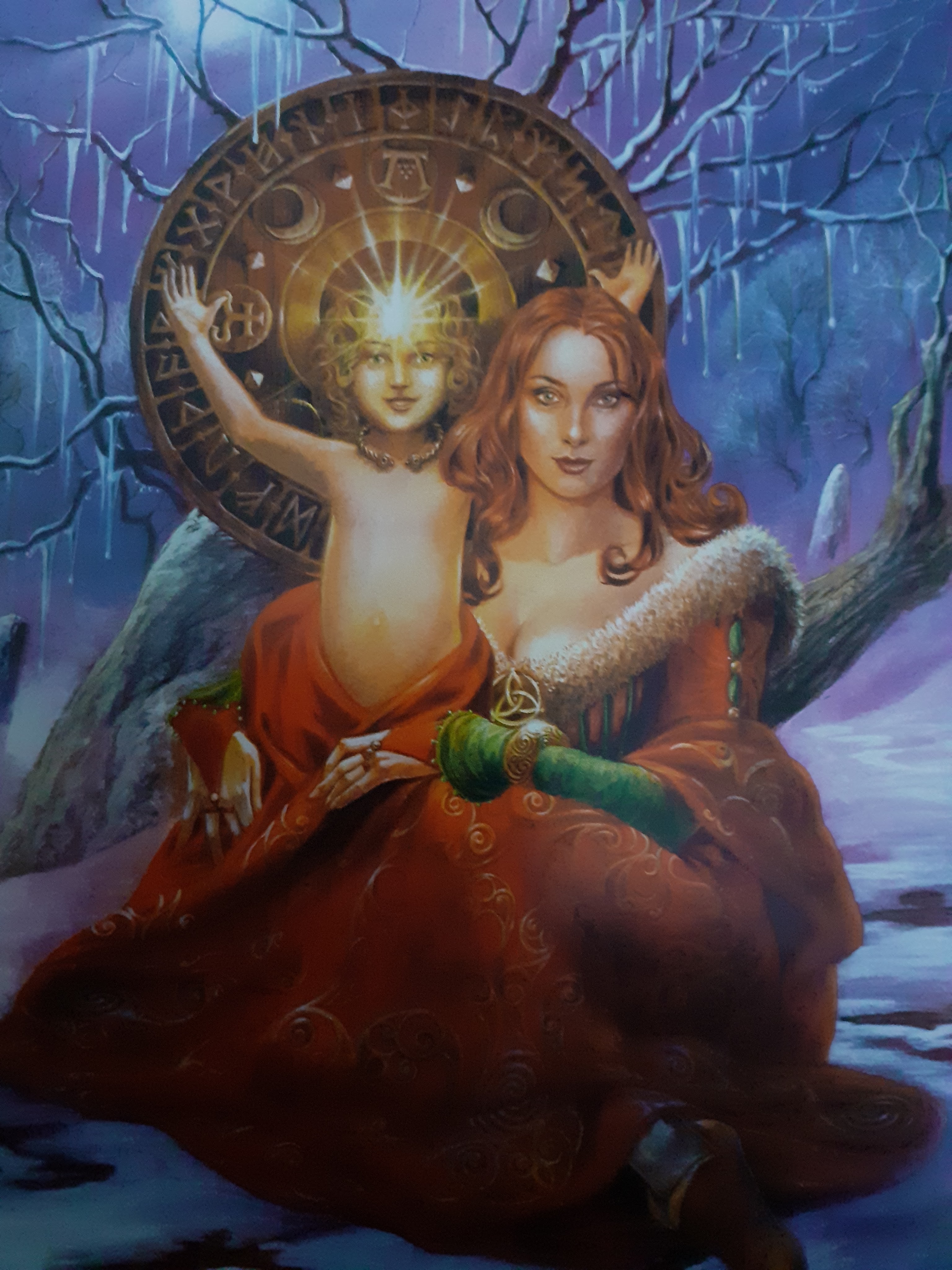 I see the child in the image as androgyne, and not in their earliest infancy. In the song, Mabon is not gendered. The mother in the picture is clearly the Goddess as Mother. Different stories can be drawn from this. In my own journey I tilt the child back somewhat to the masculine. In this pairing, She is Zoe, the life eternal. He is Bios, the life that comes and goes and comes again. Like Taliesin (4), transmuting out of his identity as Gwion, Mabon becomes in a sense his own father. So my midwinter picture appears to reference the Christmas story, but in important ways diverges from it. The image shows a magical midwinter child, who will indeed have an illuminating and transformational influence, but who is not exactly a redeemer in the Christian sense. This is drawn out in the Silver in the Tree song, which includes specifically Celtic references and extends beyond them.