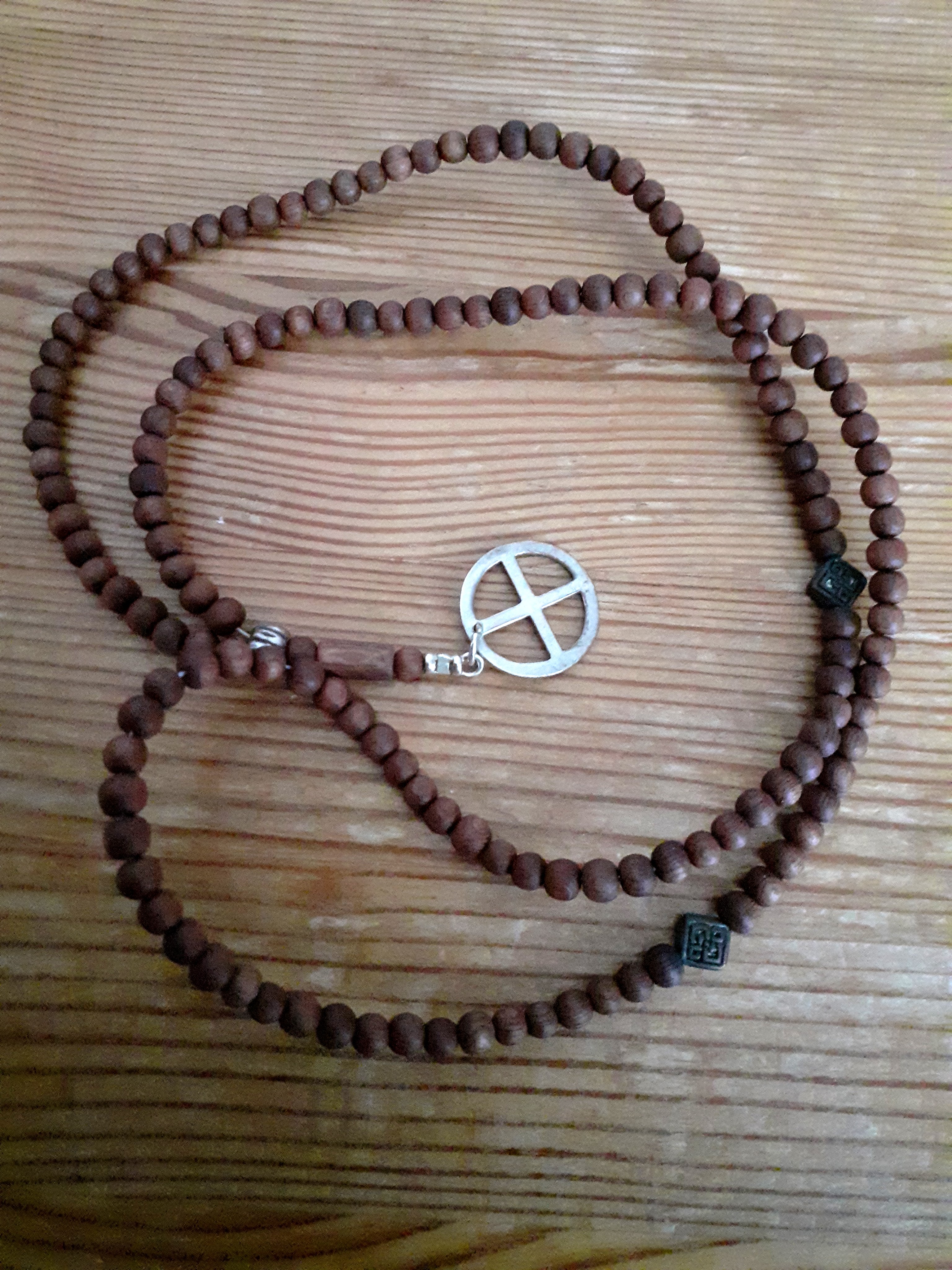 Now, coming back to this beautiful artifact, I am principally focused on the cross – an equal armed and circled silver cross that hangs from the beads – at heart level when worn as a necklace. This form of cross is an ancient symbol, sacred to many people in many cultures, often understood as a sun wheel, and not specific to Celtic Christianity. It is sometimes called the balanced, or peaceful, cross.