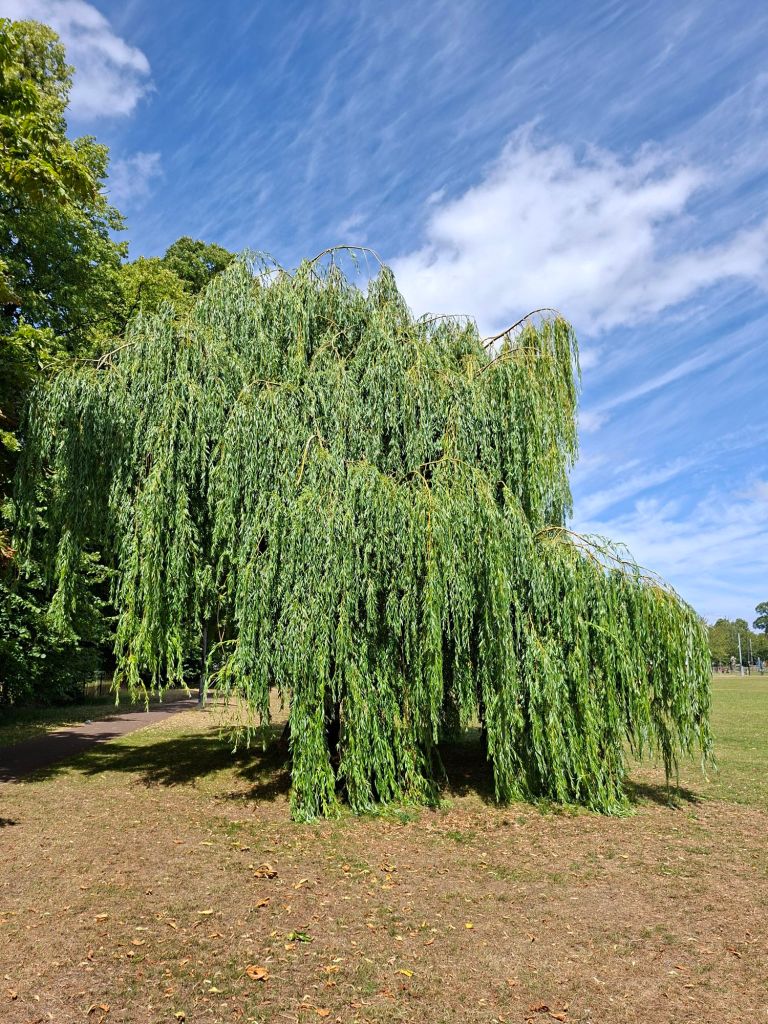 It’s a warm afternoon. The sun is strong. The park is parched. I could do with some moments of shelter. I walk towards a welcome willow tree.