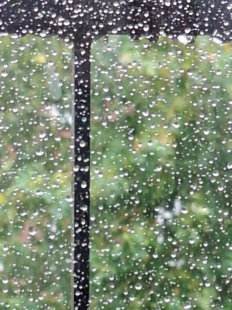 Rain on a window pane is central to the next image. The rain drops are the primary subject. What’s on the other side (a balcony garden) isn’t entirely clear in the picture and doesn’t need to be. I experience a great sense of cleansing and refreshment here – the water of life as it falls from the sky, each drop itself an ocean. I look out from my interior space, two stories above the ground floor, and connect with this bounty.