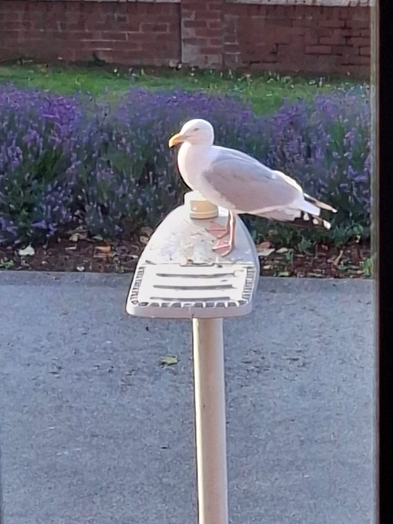 On a convenient lamp post, the seagull seeks an opportunity. This midsummer world is alive.